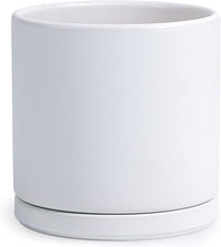 D'vine Dev 8 Inch Ceramic Planter Pot with Drainage Hole and Saucer, Indoor Cylinder Round Planter Pot, White, 94-O-D-1
