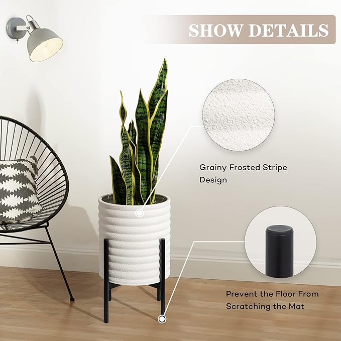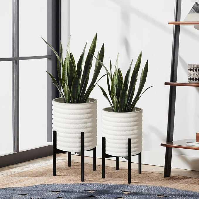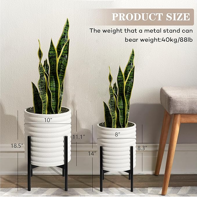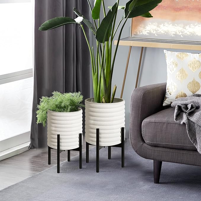 Oakrain Plants Pots with Stand, Set of 2 Indoor Planter Pots, Mid-Century Decorative Metal Flower Pots with Drainage for Living Room, Office, Garden, Balcony, 8"&10", White