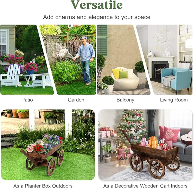 Wood Wagon Planter for Outdoor Balcony Decor - Garden Rustic Wooden Flower Cart with Wheels for Outside Garden Decor Wheelbarrow Planter for Patio