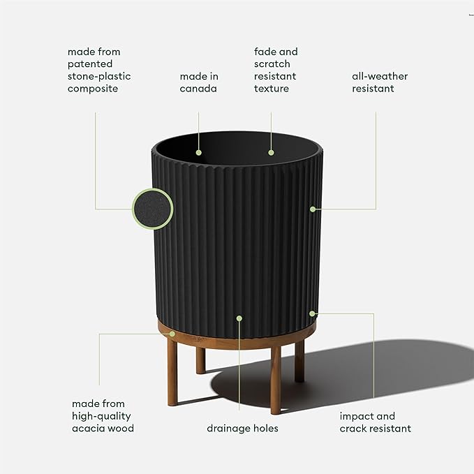 Veradek Demi Series Round Planter w/Stand for Porch/Patio | Durable Plastic-Stone Composite & Wooden Stand | Modern Décor for Tall Plants, Flowers