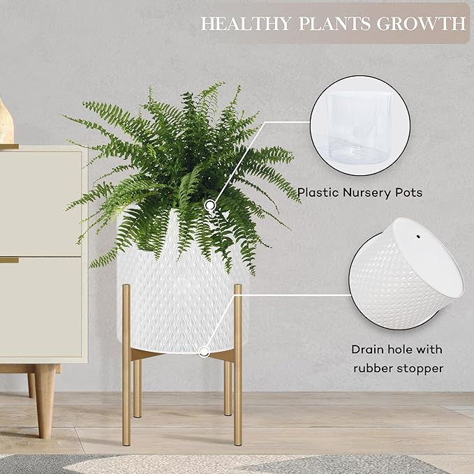 Oakrain Mid Century Planters for Indoor Plants, Set of 2, Modern Decorative Metal Planters for Living Room, Office, Garden or Balcony, White Planters with Stands, 10 inch & 12 inch