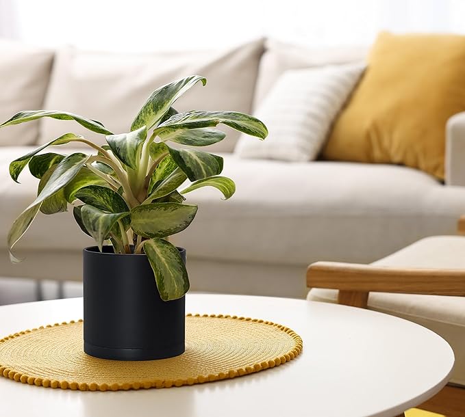 D'vine Dev 2 Pack 6 Inch Modern Plastic Plant Pots, Small Garden Planters for Plant with Drainage Holes and Saucers, Black Color, 74-Y-J-1