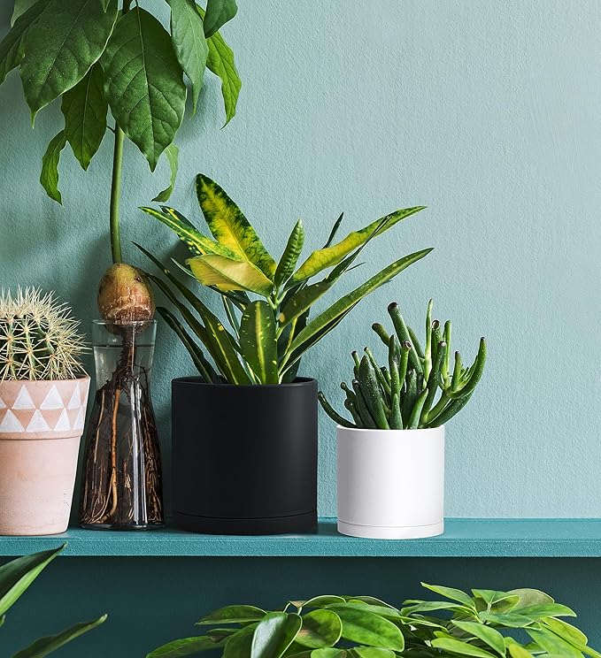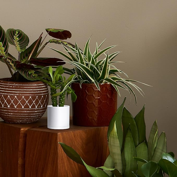 D'vine Dev 4 Pack 4.5 Inch Modern Plastic Plant Pots, Small Garden Planters for Plant with Drainage Holes and Saucers, White Color, 74-Z-F-2
