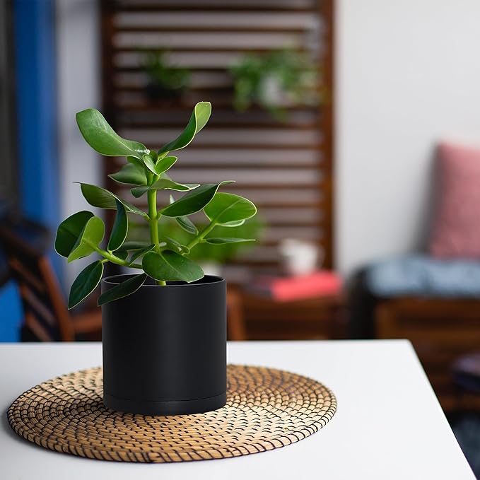 D'vine Dev 4 Pack 5 Inch Modern Plastic Plant Pots, Small Garden Planters for Plant with Drainage Holes and Saucers, Black Color, 74-Y-G-2