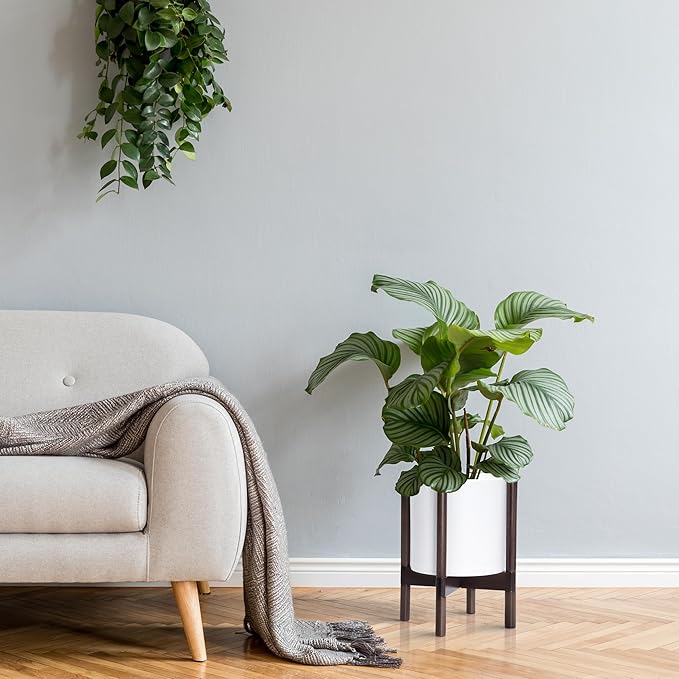 D'vine Dev Planter Pot with Stand - 10 Inch Plastic Cylinder Flower Pot with Wood Planter Holder for Indoor, Matte White Pot + Walnut Color Stand, 55-C-L-1