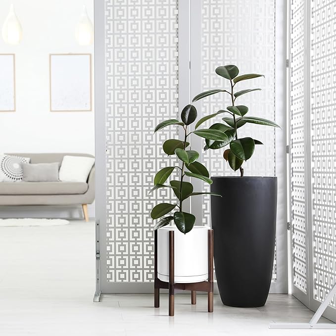 D'vine Dev Ceramic Planter with Walnut Color Stand - 10 Inch Modern Round Flower Pot with Wood Planter Holder, White, 55-B-X-1