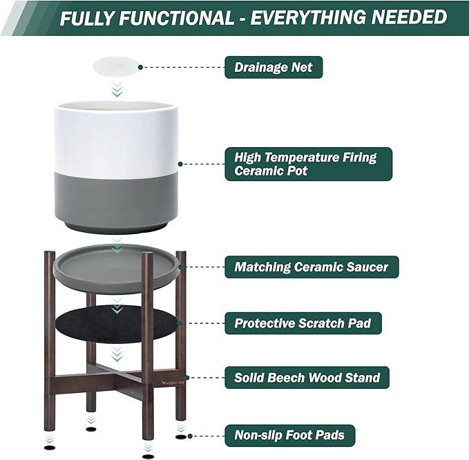D'vine Dev Ceramic Planter with Walnut Color Stand - 12 Inch Modern Round Flower Pot with Wood Planter Holder, White/Grey, 55-B-W-6