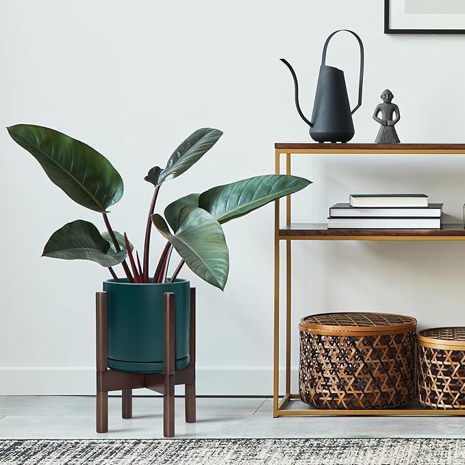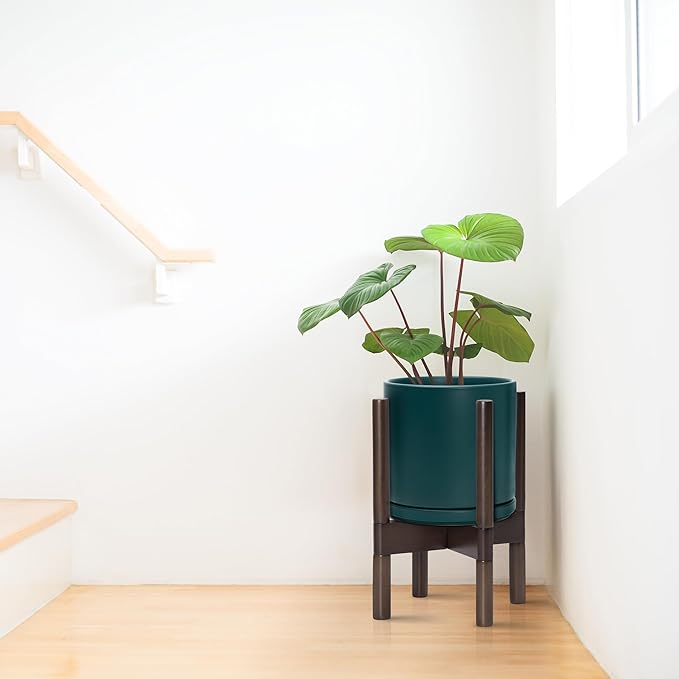 D'vine Dev Ceramic Planter with Walnut Color Stand - 8 Inch Modern Round Flower Pot with Wood Planter Holder, Teal, 55-B-Y-4