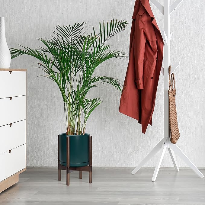 D'vine Dev Ceramic Planter with Walnut Color Stand - 10 Inch Modern Round Flower Pot with Wood Planter Holder, Teal, 55-B-X-4