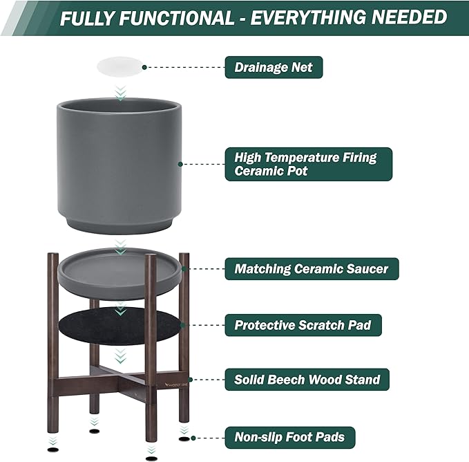 D'vine Dev Ceramic Planter with Walnut Color Stand - 12 Inch Modern Round Flower Pot with Wood Planter Holder, Grey, 55-B-W-3