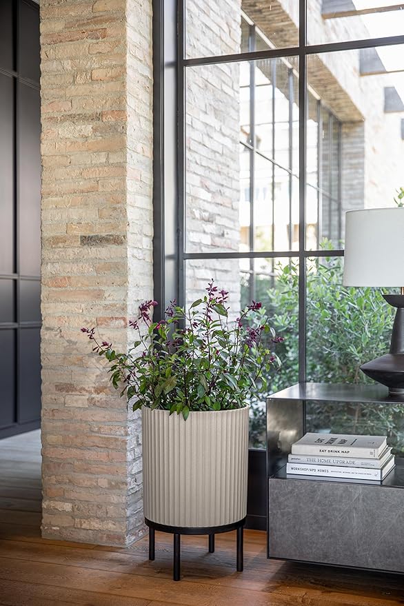 Veradek Demi Series Round Planter w/ Stand for Porch/Patio | Durable Plastic-Concrete & Wooden Stand | Modern Décor for Tall Plants, Flowers