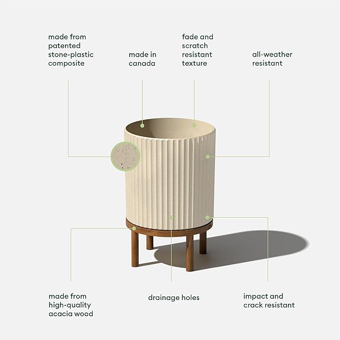 Veradek Demi Series Round Planter w/Stand for Porch/Patio | Durable Plastic-Stone Composite & Wooden Stand | Modern Décor for Tall Plants, Flowers