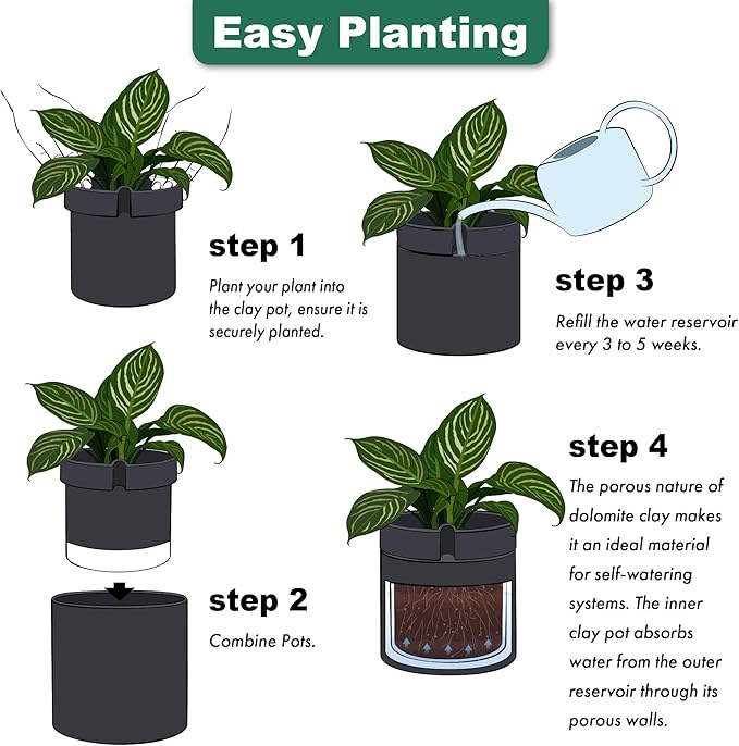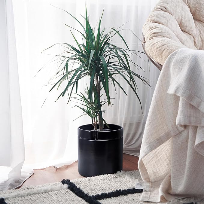 Phoenix Vine 10 Inch Cylinder Self Watering Planter, Black Glazed Outer Plant Pot with Dolomite Clay Inner Planter for Indoor Plants, Black, 31-A-I-B