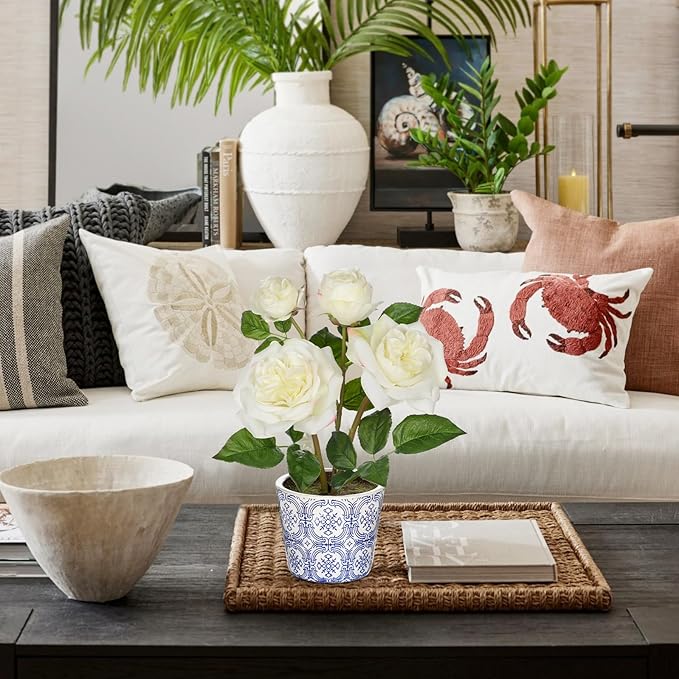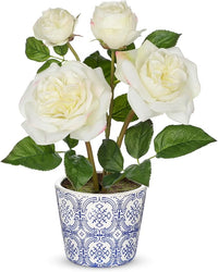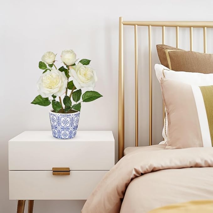 Hollyone White Roses Artificial Flowers in Blue and White Porcelain Vase 13.4" Fake Roses Flower Arrangement Artificial Plants & Flowers Potted Plant Faux Silk Rose Flower with Ceramic Pot Home Decor