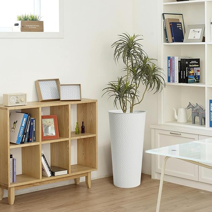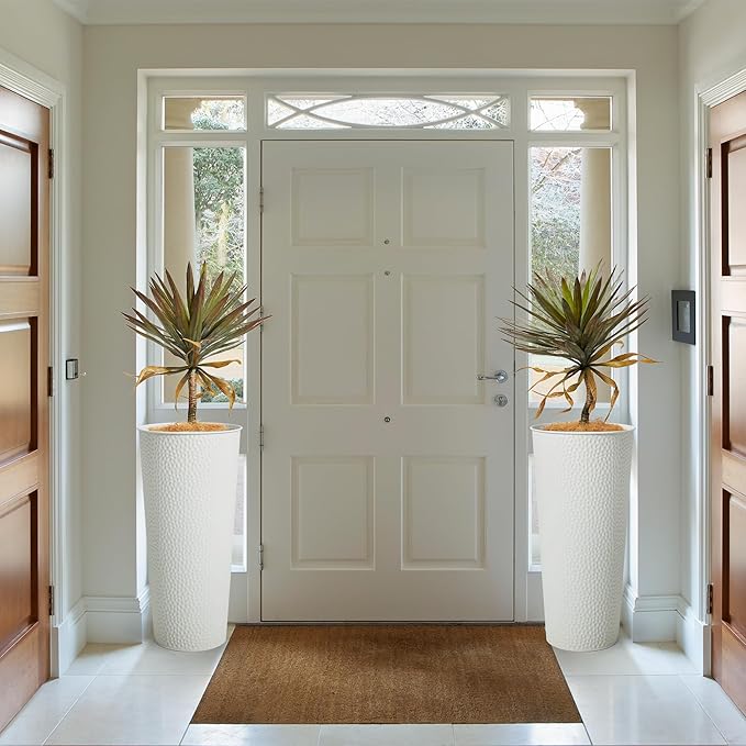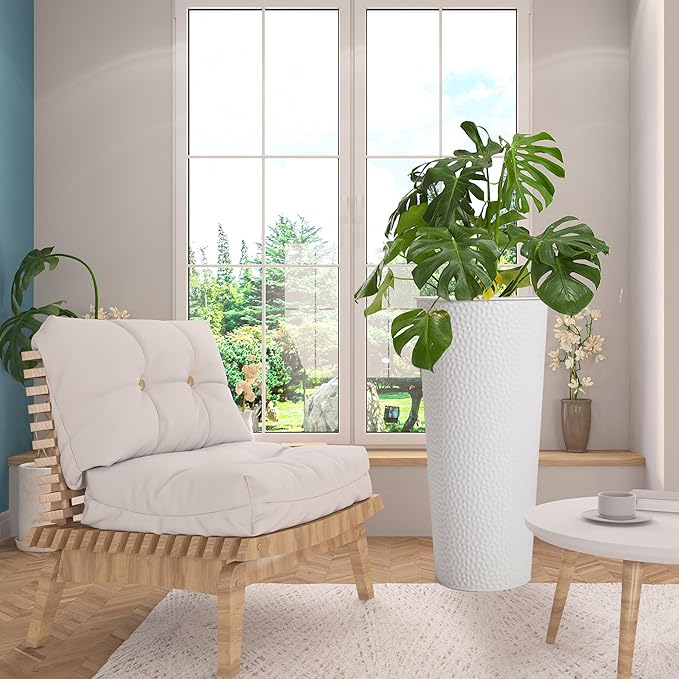 Worth Garden 2-Pack 25" H. Metal Planter with 2X Inside Pots - Hand-Hammered Texture Tall Tapered Plant Pots - Large Handcrafted Flower Pot for Indoor Outdoor, Deck, Patio, Front Porch (White)