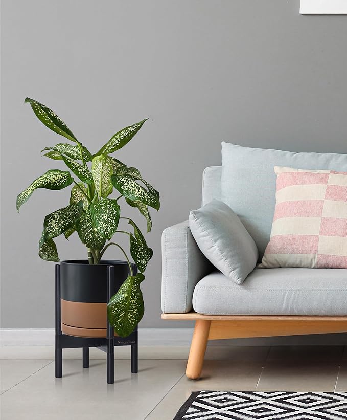 D'vine Dev Ceramic Planter with Ebony Stand - 10 Inch Modern Round Flower Pot with Wood Planter Holder, Black/Speckled Tan, 55-B-L-7