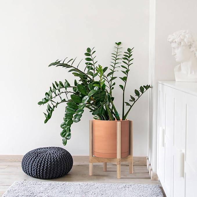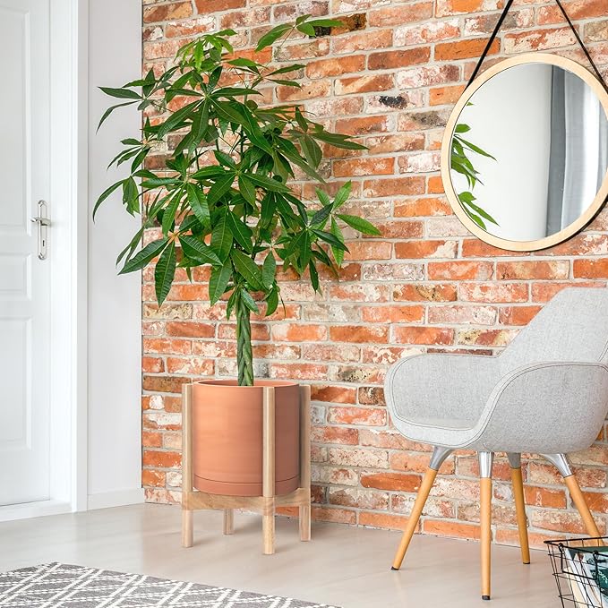 D'vine Dev Terracotta Planter with Natural Stand - 12 Inch Modern Round Flower Pot with Wood Planter Holder, Terracotta, 55-B-J-5