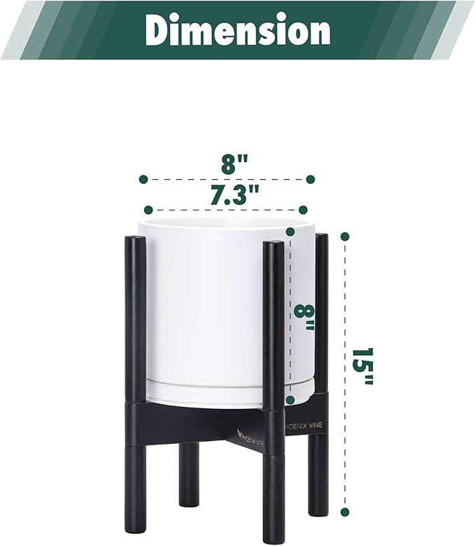 D'vine Dev Ceramic Planter with Ebony Stand - 8 Inch Modern Round Flower Pot with Wood Planter Holder, White, 55-B-M-1