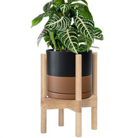 D'vine Dev Ceramic Planter with Natural Stand - 8 Inch Modern Round Flower Pot with Wood Planter Holder, Black/Speckled Tan, 55-B-N-7