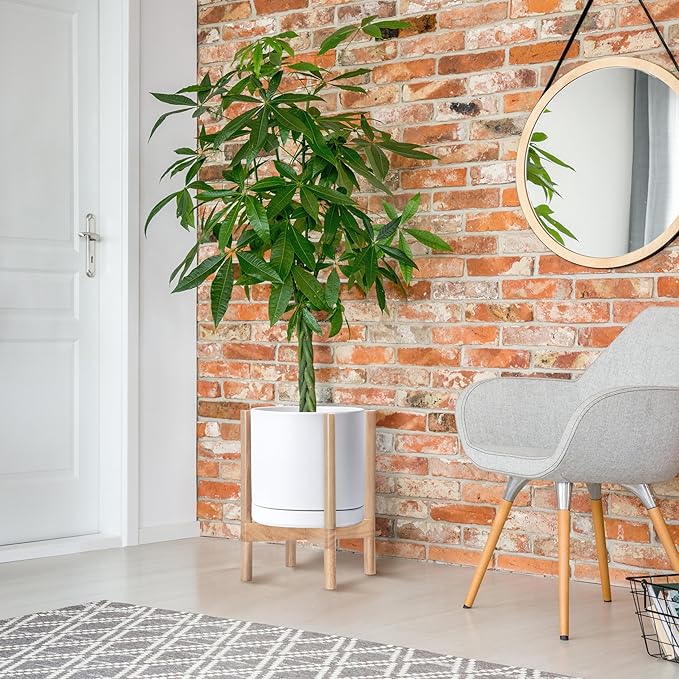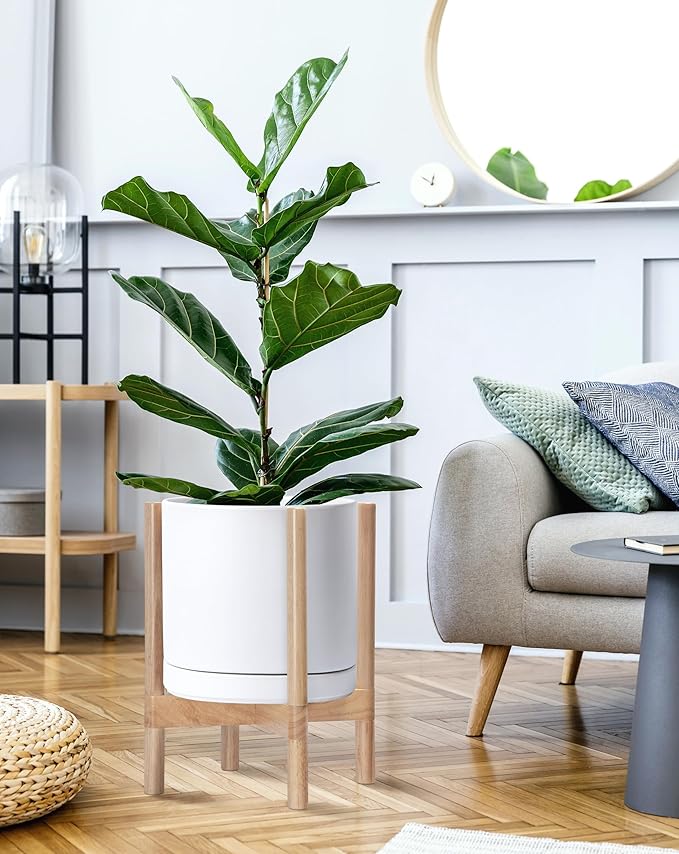 D'vine Dev Ceramic Planter with Natural Stand - 12 Inch Modern Round Flower Pot with Wood Planter Holder, White, 55-B-J-1