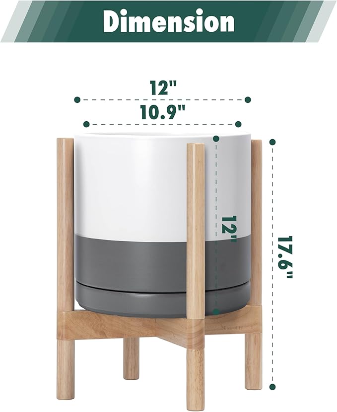 D'vine Dev Ceramic Planter with Natural Stand - 12 Inch Modern Round Flower Pot with Wood Planter Holder, White/Grey, 55-B-J-6