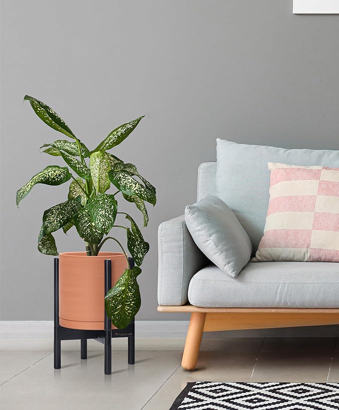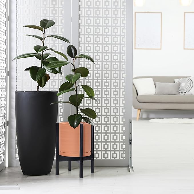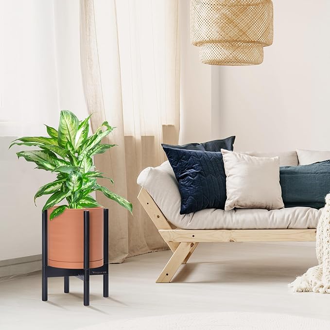 D'vine Dev Terracotta Planter with Ebony Stand - 10 Inch Modern Round Flower Pot with Wood Planter Holder, Terracotta, 55-B-L-5