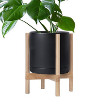 D'vine Dev Ceramic Planter with Natural Stand - 12 Inch Modern Round Flower Pot with Wood Planter Holder, Black, 55-B-J-2