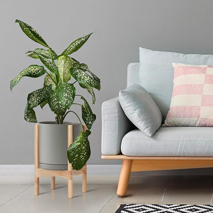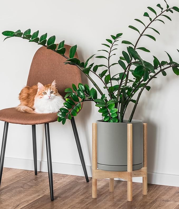 D'vine Dev Ceramic Planter with Natural Stand - 10 Inch Modern Round Flower Pot with Wood Planter Holder, Grey, 55-B-K-3