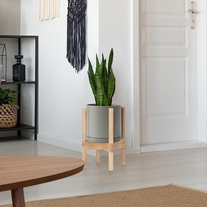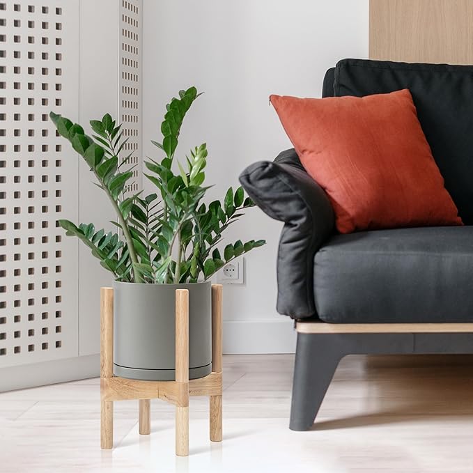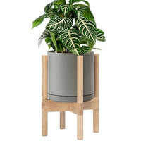 D'vine Dev Ceramic Planter with Natural Stand - 8 Inch Modern Round Flower Pot with Wood Planter Holder, Grey, 55-B-N-3