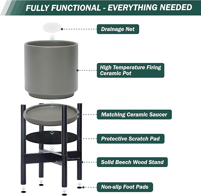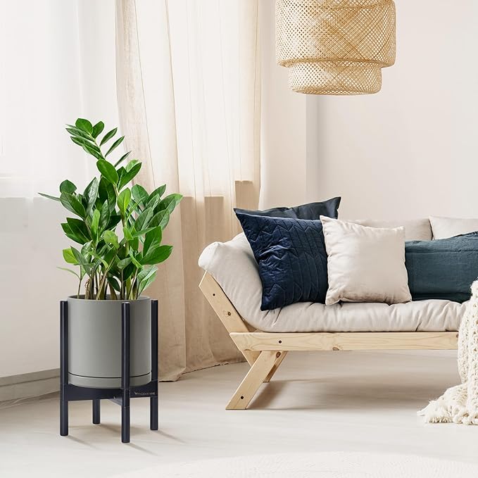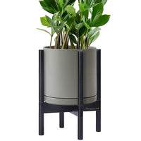 D'vine Dev Ceramic Planter with Ebony Stand - 10 Inch Modern Round Flower Pot with Wood Planter Holder, Grey, 55-B-L-3