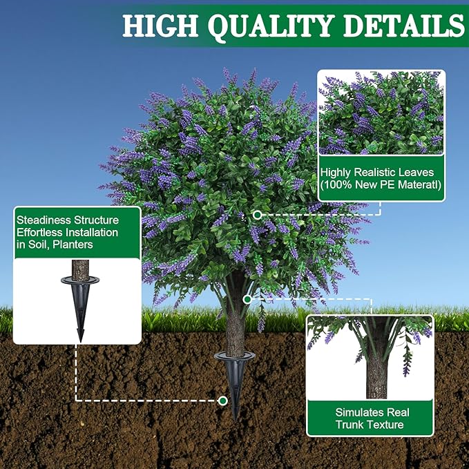 Set of 2 Artificial Lavender Boxwood Topiary Ball Bush for Outdoor with Ground Spike 22", UV Resistant Faux Greenery Shrubs, Fake Boxwood Plants for Indoor, Garden, Yard, Porch, Patio Decor