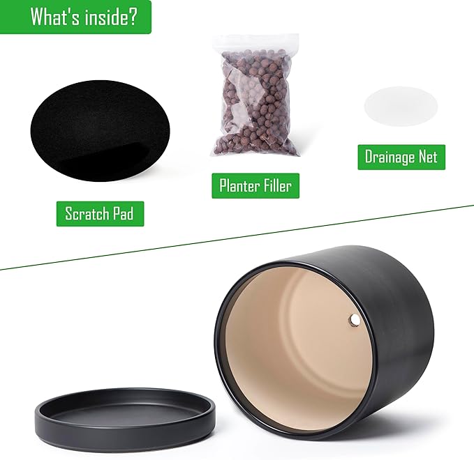 D'vine Dev 14 Inch Ceramic Planter Pot with Drainage Hole and Saucer, Indoor Cylinder Round Planter Pot, Black, 94-O-G-2