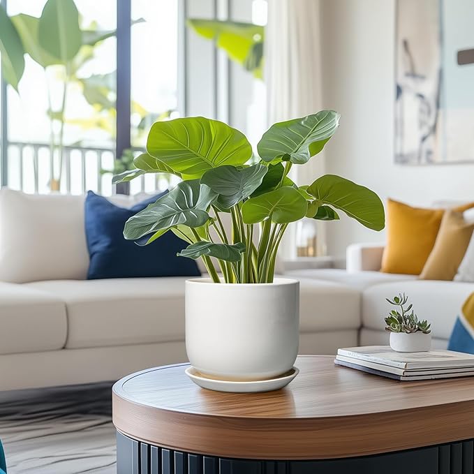 Ceramic Pot for Plants 7 Inch - Modern Round Indoor Outdoor Planter with Drainage Hole and Saucer, Home House Office Room Decor, White
