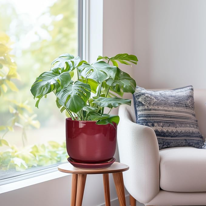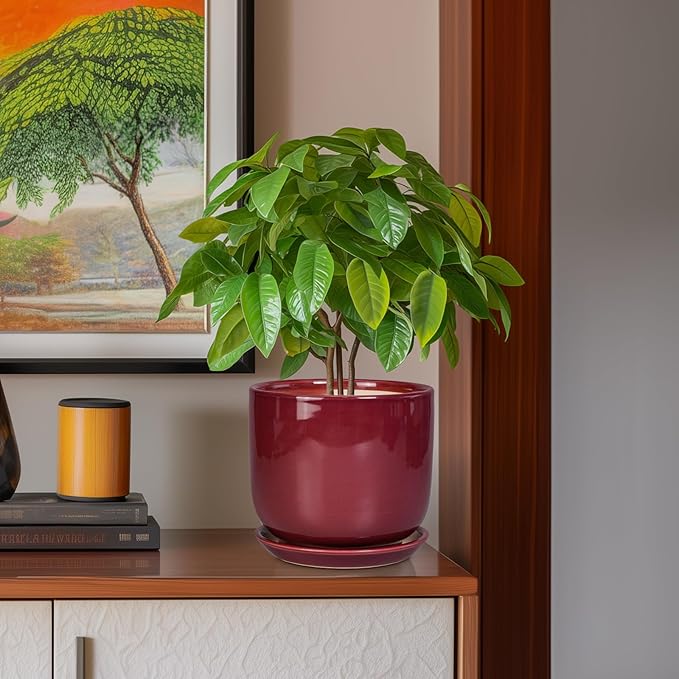 Ceramic Flower Pot for Plants - Cylinder Modern 8 Inch Plant Pot Indoor with Drainage Hole and Saucer, Home Office Room Porch Decor, Red