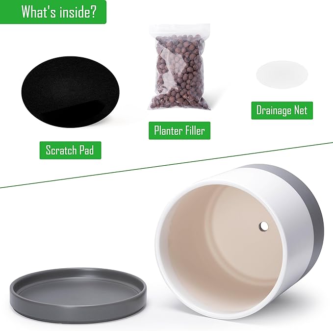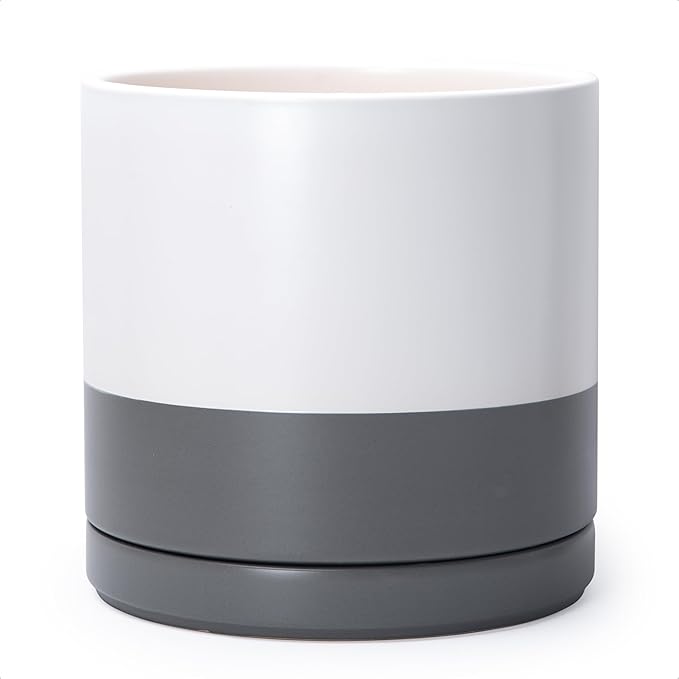 D'vine Dev 12 Inch Ceramic Planter Pot with Drainage Hole and Saucer, Indoor Cylinder Round Planter Pot, White/Speckled Grey, 94-O-F-6