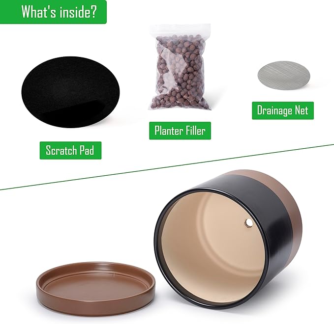 D'vine Dev 12 Inch Ceramic Planter Pot with Drainage Hole and Saucer, Indoor Cylinder Round Planter Pot, Black/Speckled Tan, 94-O-F-7