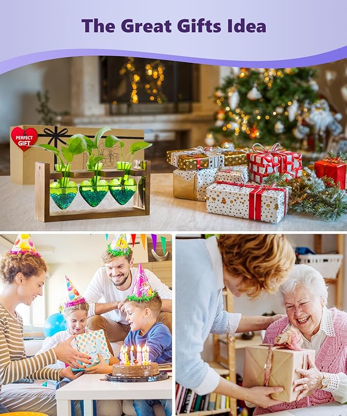 Nacome Plant Terrarium for Office Decor: Birthday Gifts for Plant Lovers Women Mom Wife - Wooden Stand Tabletop Planter 3 Bulb Glass Vase Heart Shaped for Hydroponics Indoor Home(Green)