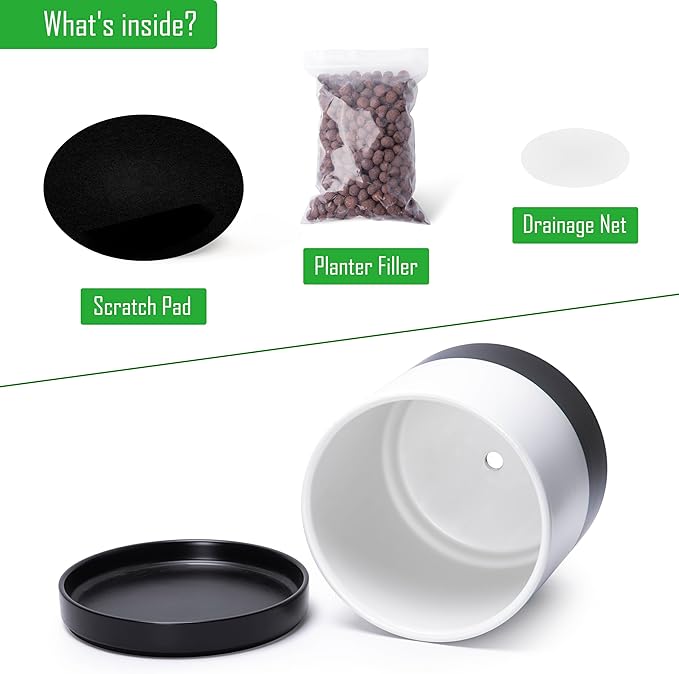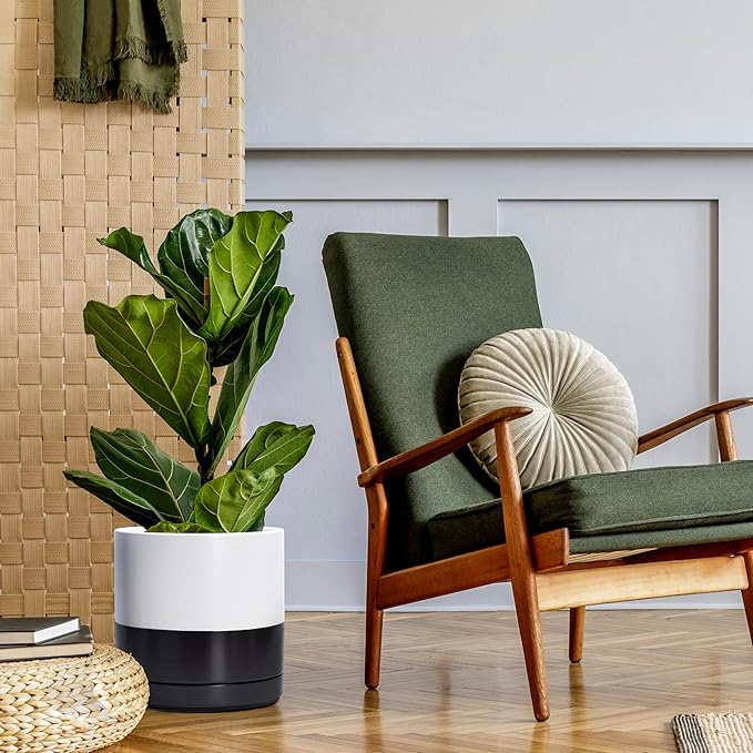 D'vine Dev 10 Inch Ceramic Planter Pot with Drainage Hole and Saucer, Indoor Cylinder Round Planter Pot, Layered Monochrome Black & White, 94-O-E-L