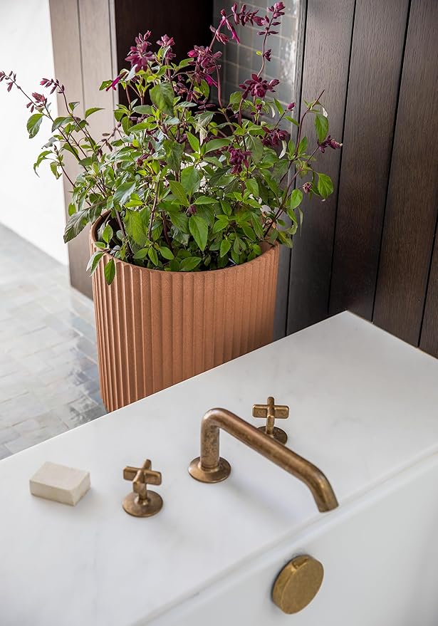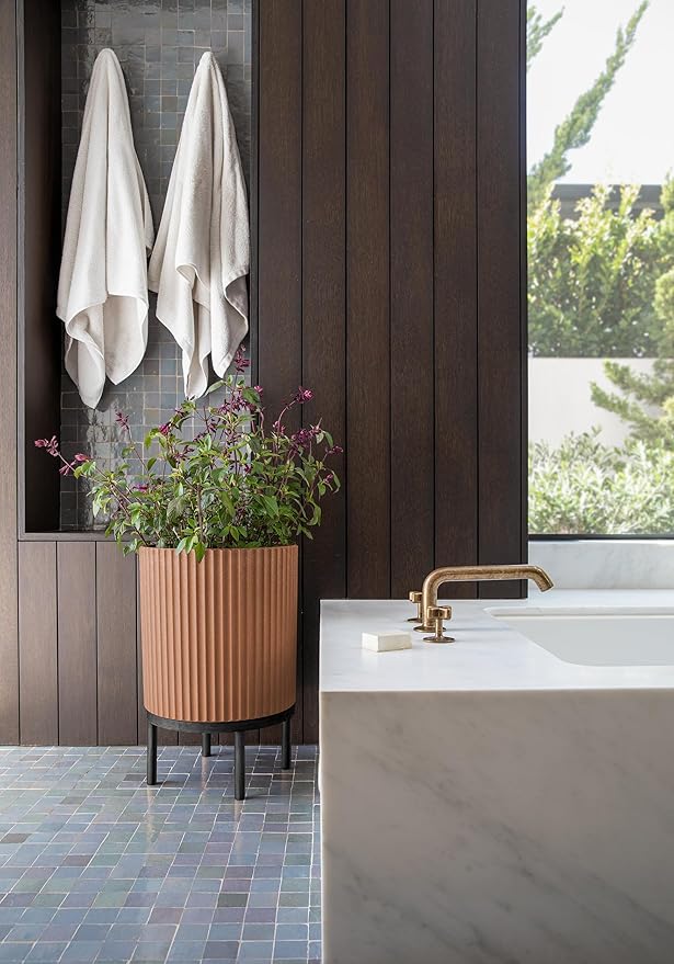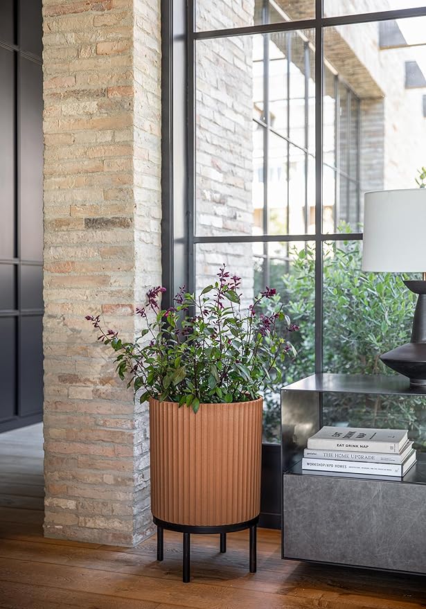 Veradek Demi Series Round Planter w/Stand for Porch/Patio | Durable Plastic-Stone Composite & Wooden Stand | Modern Décor for Tall Plants, Flowers Sale