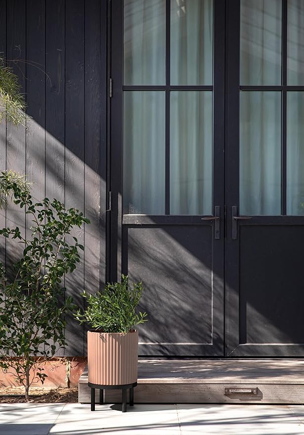 Veradek Demi Series Round Planter w/Stand for Porch/Patio | Durable Plastic-Stone Composite & Wooden Stand | Modern Décor for Tall Plants, Flowers