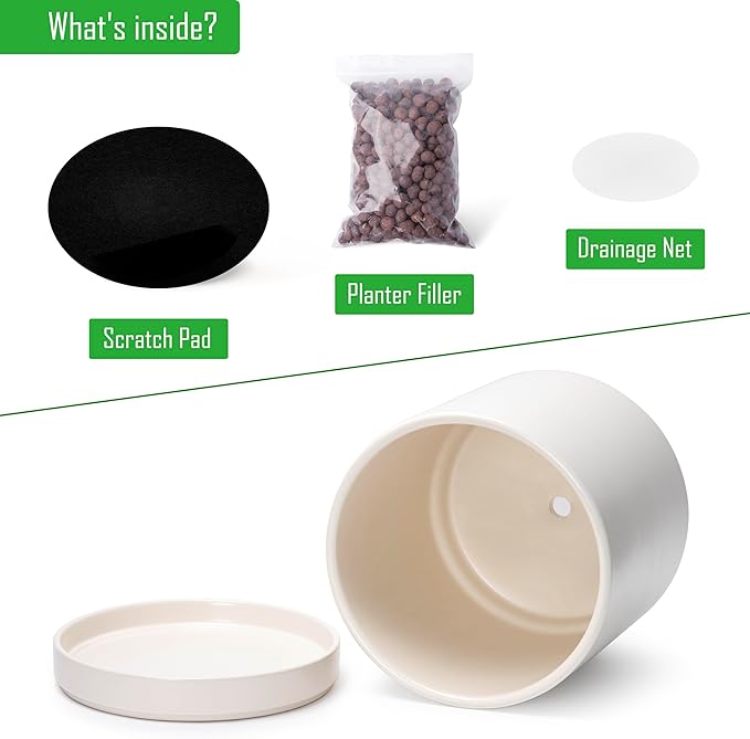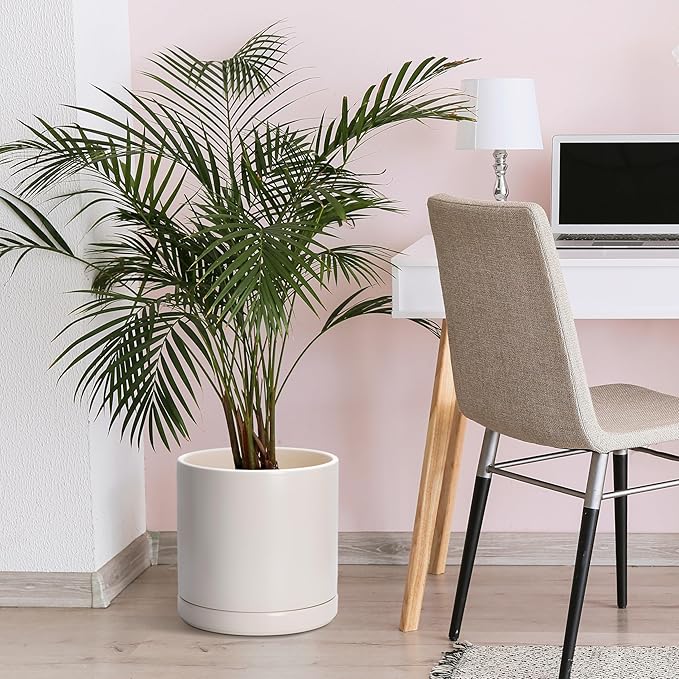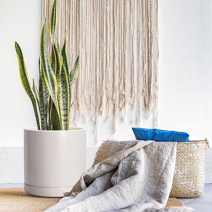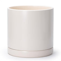 D'vine Dev 12 Inch Ceramic Planter Pot with Drainage Hole and Saucer, Indoor Cylinder Round Planter Pot, Oatmeal, 94-O-F-8