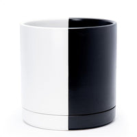 D'vine Dev 10 Inch Ceramic Planter Pot with Drainage Hole and Saucer, Indoor Cylinder Round Planter Pot, Split Monochrome Black & White, 94-O-E-0