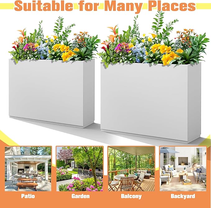 Large Rectangle Planter Metal White Planter Box with a Drainage Hole and a Removable Divider Indoor Outdoor Porch Pots for Tall Plants, Trees, Flowers 35.43" x 9.06" x 25.59" White