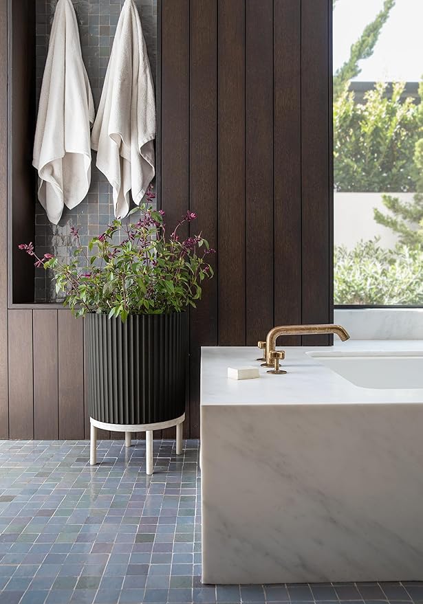 Veradek Demi Series Round Planter w/Stand for Porch/Patio | Durable Plastic-Stone Composite & Wooden Stand | Modern Décor for Tall Plants, Flowers
