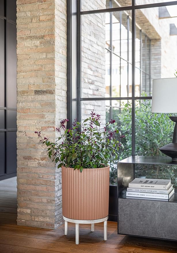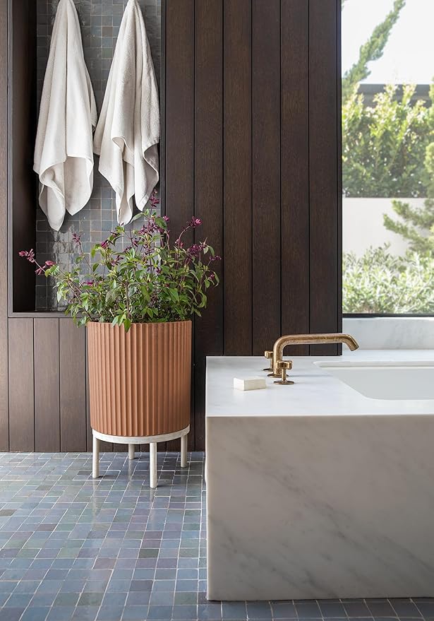 Veradek Demi Series Round Planter w/Stand for Porch/Patio | Durable Plastic-Stone Composite & Wooden Stand | Modern Décor for Tall Plants, Flowers