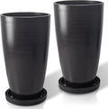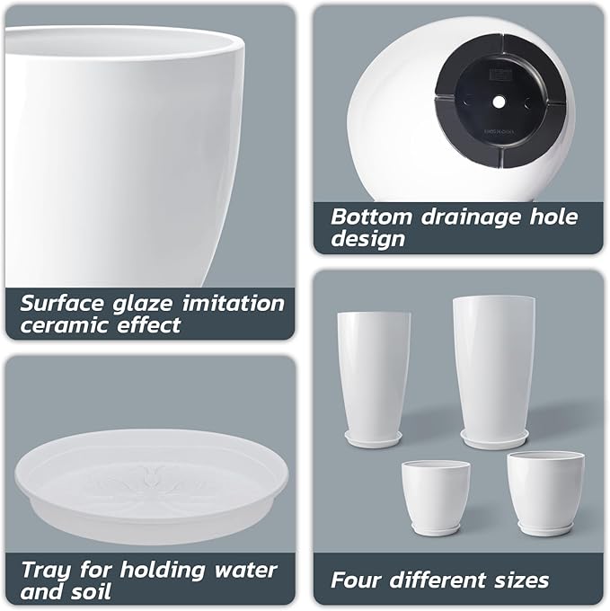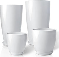 ZMTECH 24/21/12/10" H Large Plastic Planters with Drainage Hole and Saucer -Set of 4 Tall Plant Pots for Indoor & Outdoor Use,White Glossy Smooth Lightweight Flower Pot for Front Porch Patio Deck