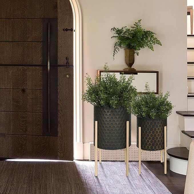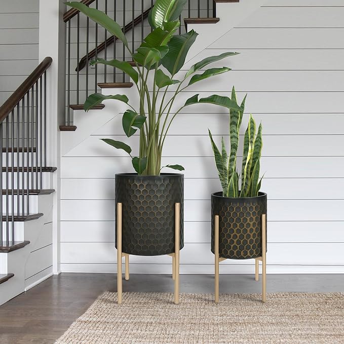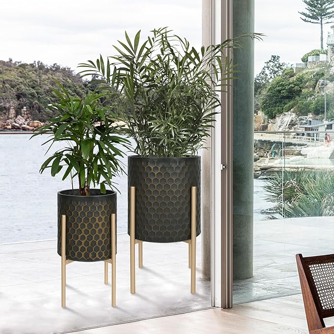 Oakrain Mid Century Planters for Indoor Plants, Set of 2, Modern Decorative Metal Pots for Living Room, Office, Garden or Balcony, Black&Golden Honeycomb, 10inch&12inch