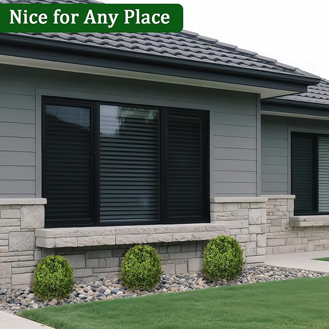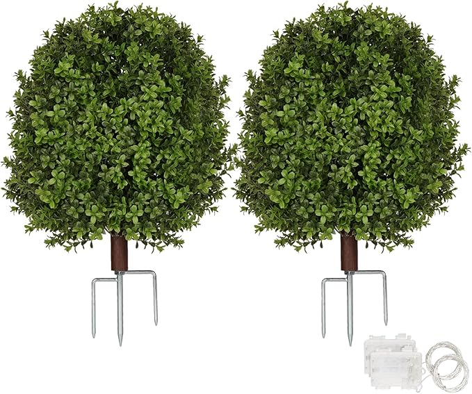 Artificial Boxwood Topiary Trees for Outdoors, 2 Pack Faux Topiary Ball Tree UV Resistant Fake Shrubs Evergreen Bush Plants for Front Porch Garden Yard Balcony Wedding Decor, 2 Led String Light