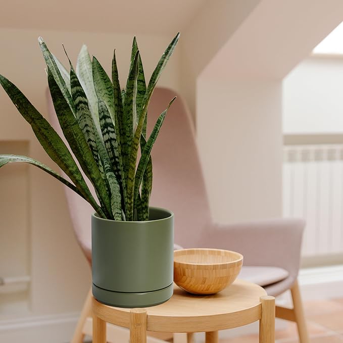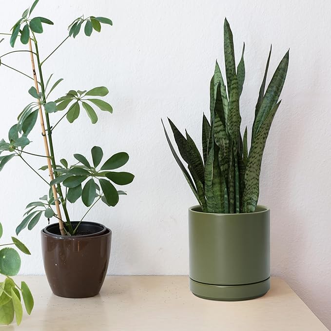 D'vine Dev Set of 2 Plants Pots, 6.5 Inch Ceramic Planter Pot for Plants with Drainage Hole and Saucer, Olive, 94-V-C-J