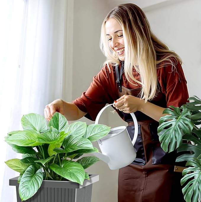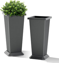 FENCY Set of 2 Tall Planters for Outdoor Plants, 24 Inch Large Tapered Pots with Drainage Trays, Weather-Resistant Plastic Plant Containers for Patio, Porch, Garden, Front Door Decor,Gray,Striped